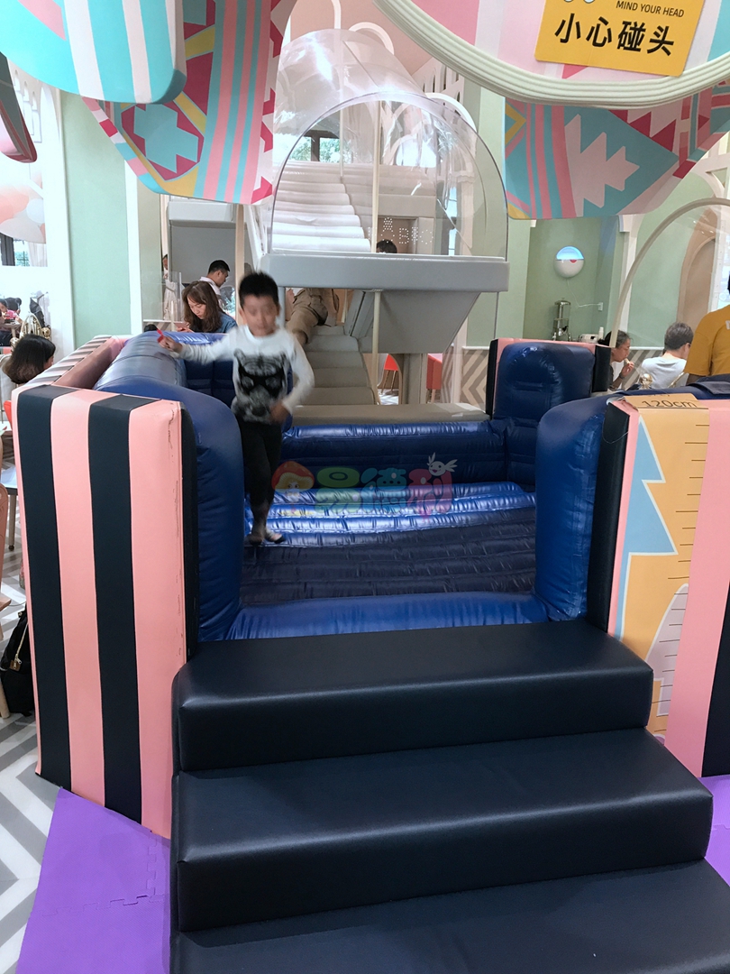 在暢玩之后,家長們就可以帶著小朋友來餐廳享受美味佳肴了。餐廳的設計風格也是別具匠心,四周有很多像熱氣球懸掛著的游戲盒子,幽長的透明隧道串聯起這些游戲屋,小朋友們可以在里面爬來爬去嬉戲玩鬧。就餐位置離這些游戲屋很近,讓家長們可以在用餐的同時也可以照看到自己的小寶寶。餐廳區還準備了兩個VIP的房間對于想安靜就餐的家長和孩子又是一大福音!