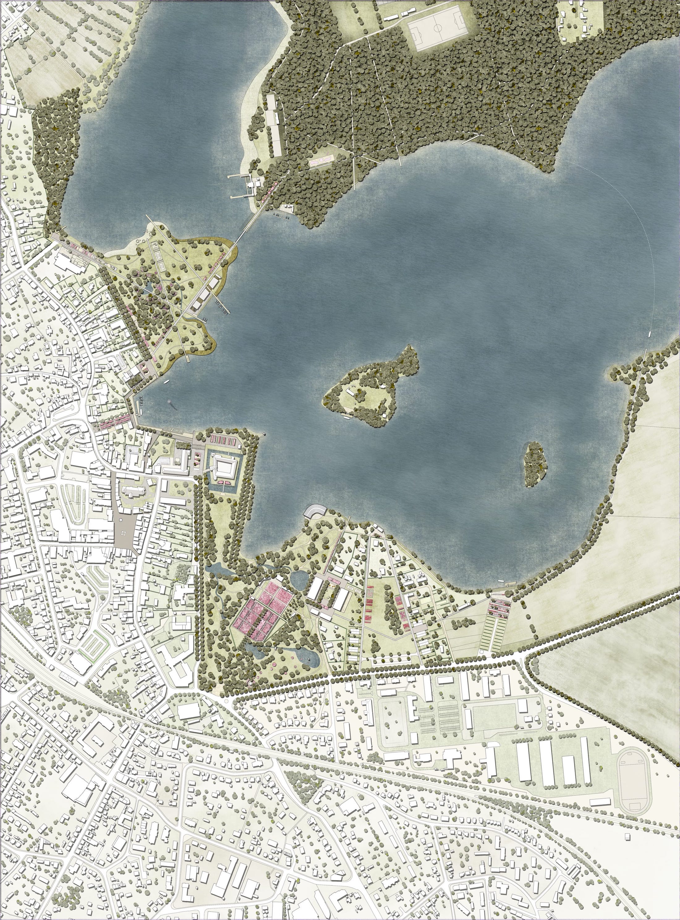 Eutin是一個該地區(qū)重要的住宅和商業(yè)區(qū)域,也是老城市中心,以磚木結(jié)構(gòu)建筑、古典建筑和巴洛克式的城堡為特色,坐落兩個風(fēng)景如畫的湖泊之間,即Großer Eutiner湖和Kleiner Eutiner湖。該地區(qū)位于荷爾斯泰因瑞士自然保護(hù)區(qū)內(nèi),是德國北部內(nèi)陸地區(qū)最受歡迎的旅游目的地。盡管位置優(yōu)越,但除了歷史悠久的Schlossgarten (城堡花園)之外,湖岸未建的城市地區(qū)在設(shè)計(jì)或娛樂質(zhì)量方面卻鮮有建樹。水幾乎沒有得到考慮,沒有道路網(wǎng)絡(luò),更明顯的是,沒有家庭和年輕人真正的體育或娛樂機(jī)會,受到地標(biāo)保護(hù)的Schlossgarten suf也因其使用需求過高而受損。
