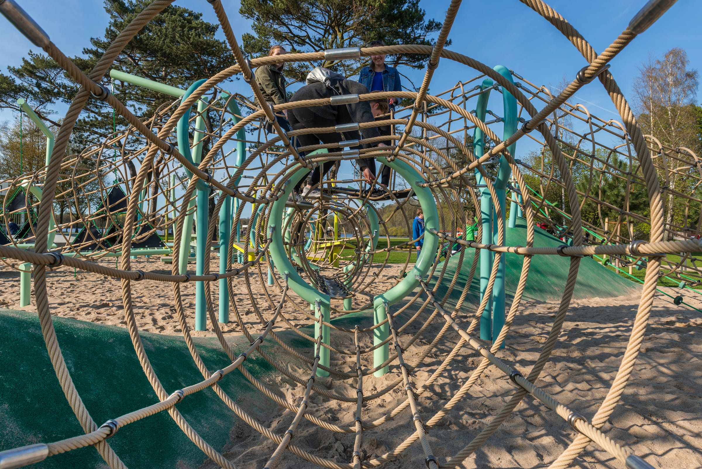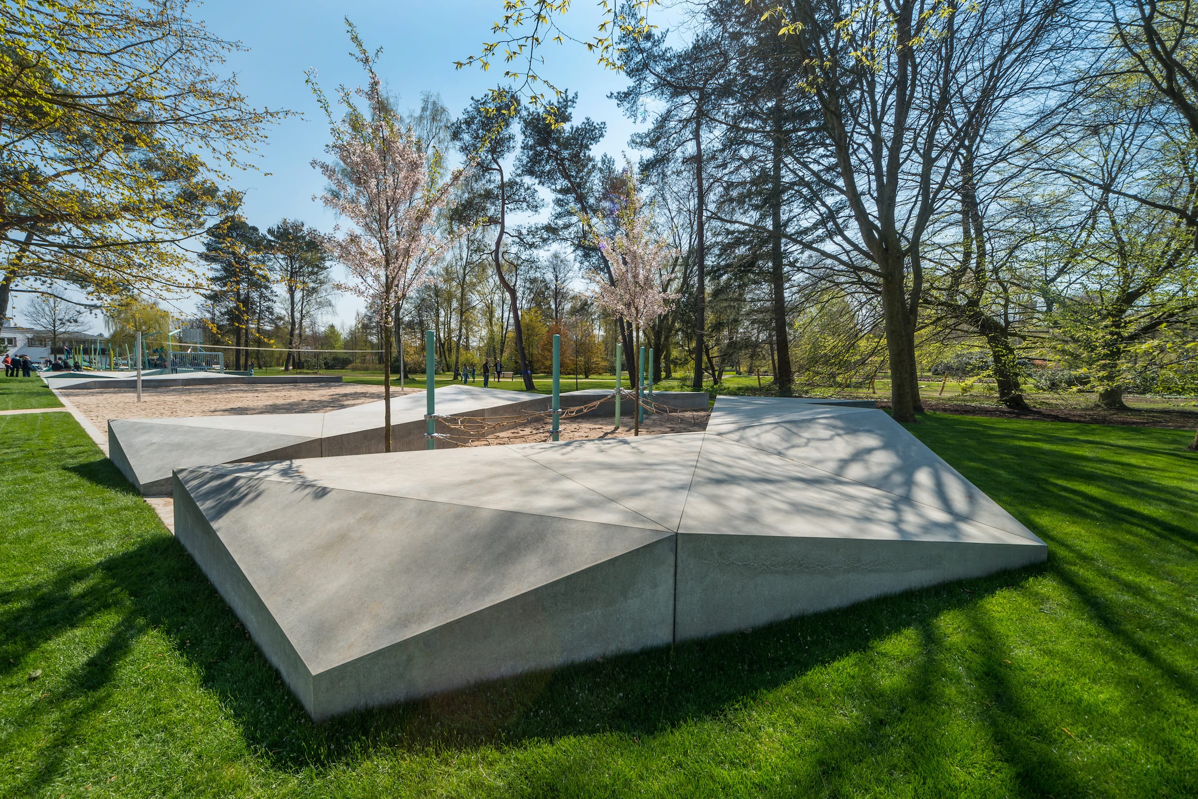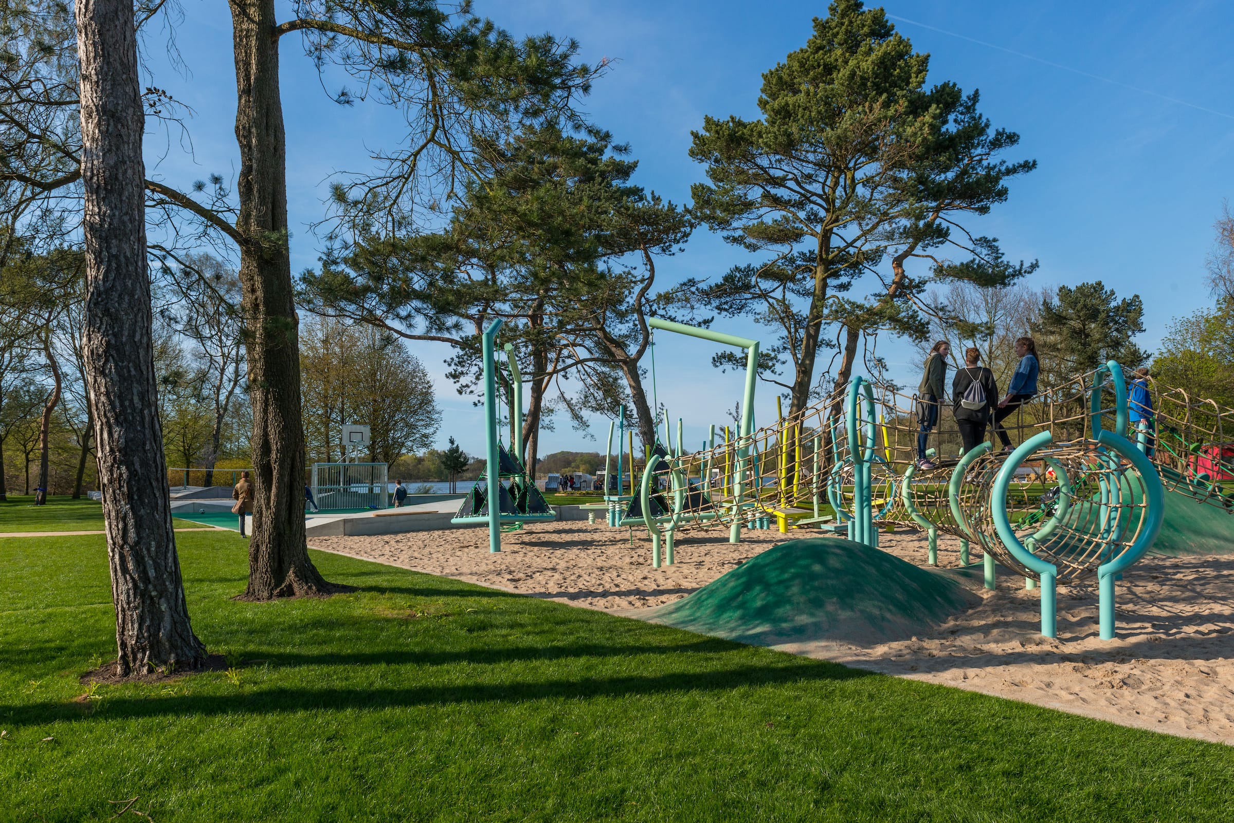 作為與歷史悠久的Schlossgarten公園形成對比的一個景觀,Seepark已發(fā)展成為一個娛樂性的景觀,為家庭、兒童和青少年提供了各種各樣的活動空間,緩解了以前對地標(biāo)保護(hù)花園的過度使用。除了開闊的放松區(qū)域,它還提供了許多戶外活動機(jī)會,為兒童和青少年舉辦講習(xí)班,設(shè)計(jì)他們自己的游戲和運(yùn)動場地。沙灘上有日光浴區(qū),也有沙灘排球和街球的場地。“湖泊”和“森林”的主題是在一個多層面的、挑戰(zhàn)性的面向兒童的游戲世界中體現(xiàn)的,這為他們的感官而打造:攀爬可以測試他們的平衡和靈活性;網(wǎng)狀隧道像魚網(wǎng)一樣伸展,覆蓋在模型塑料表面;帶有擋泥板的松緊繩索也可以攀爬;移動的柱子創(chuàng)造了一個“搖擺的森林”;樹屋正在建造中。整個公園都有野餐和燒烤的地方。